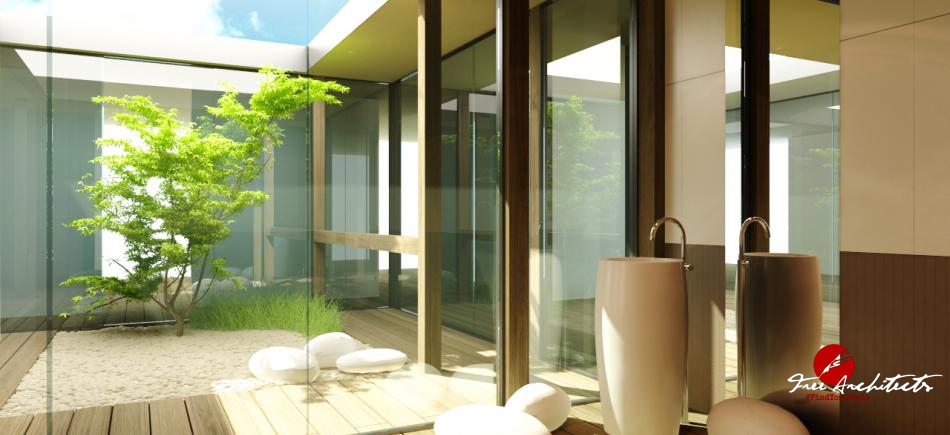 Дом делится на часть хозяев (спальня, велнес-центр, кабинет), гостевую часть, детскую комнату и часть для приемов (гостиная, столовая и кухонная линия). Внутренняя часть дома освещается солнечным светом через атриум, который в теплое время года служит как зона отдыха. Из всех жилых комнат есть выходы на открытую террасу.